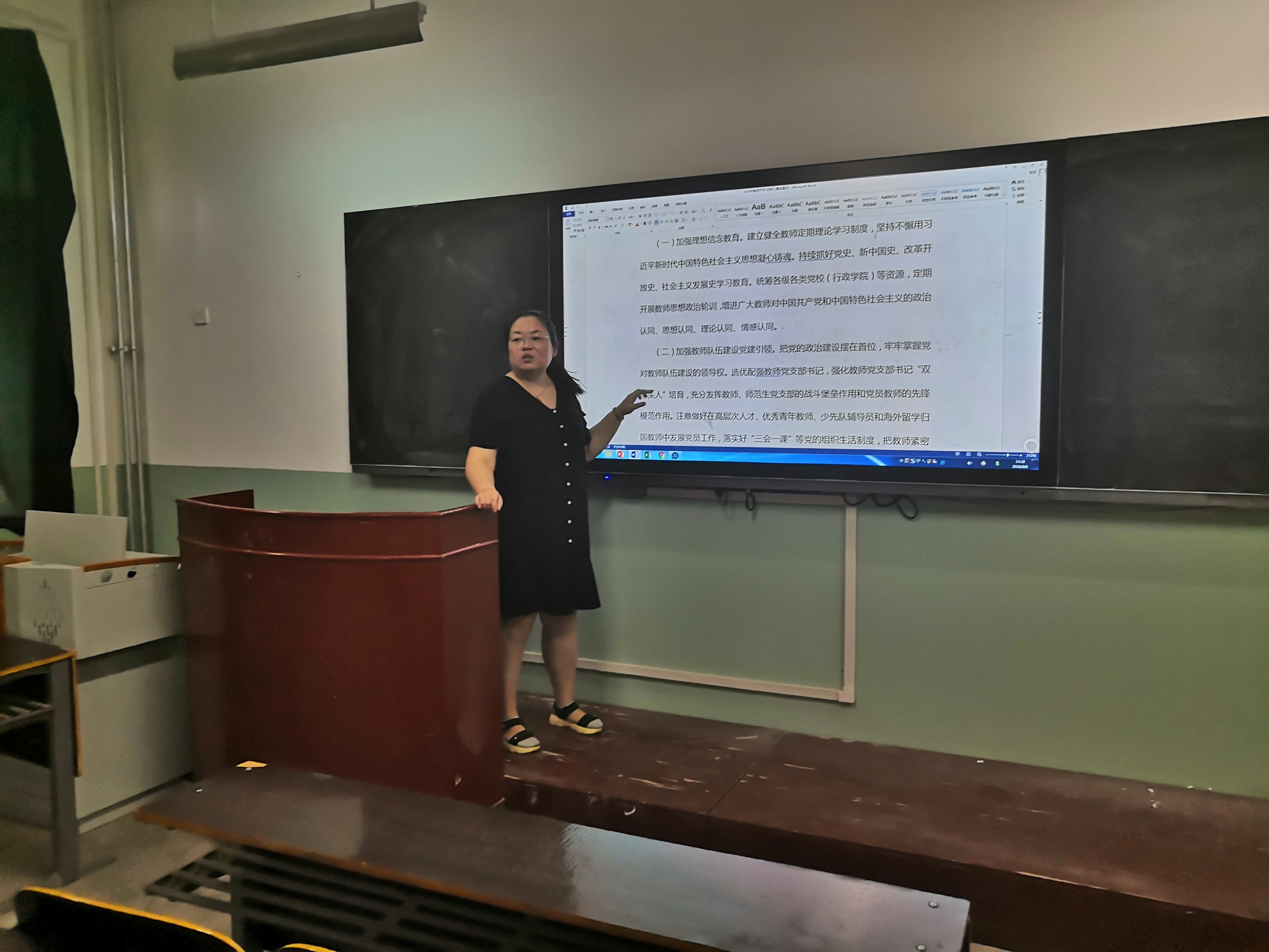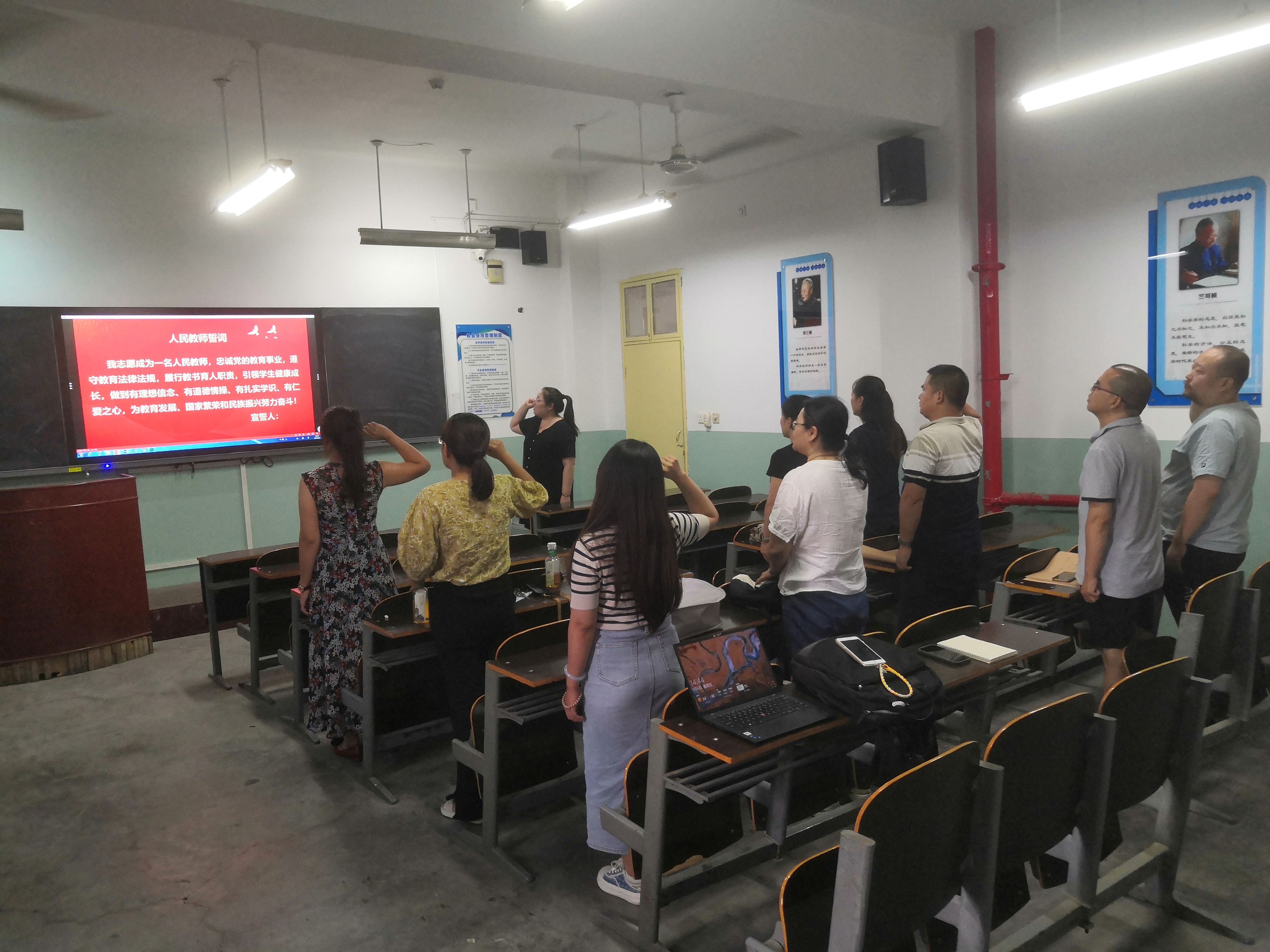 理论学习之后,教师节宣誓环节将活动推向了高潮。在张杨梅老师的带领下,两教研室全体教师面向国旗,庄严宣誓:“我志愿成为一名人民教师,忠诚党的教育事业,遵守教育法律法规,履行教书育人职责,引领员工健康成长,做到有理想有信念、有道德有情操、有扎实学识、有仁爱之心,为教育发展、国家繁荣和民族振兴努力奋斗!”铿锵有力的誓言回荡在会场,表达了教师们对教育事业的无限忠诚与热爱。