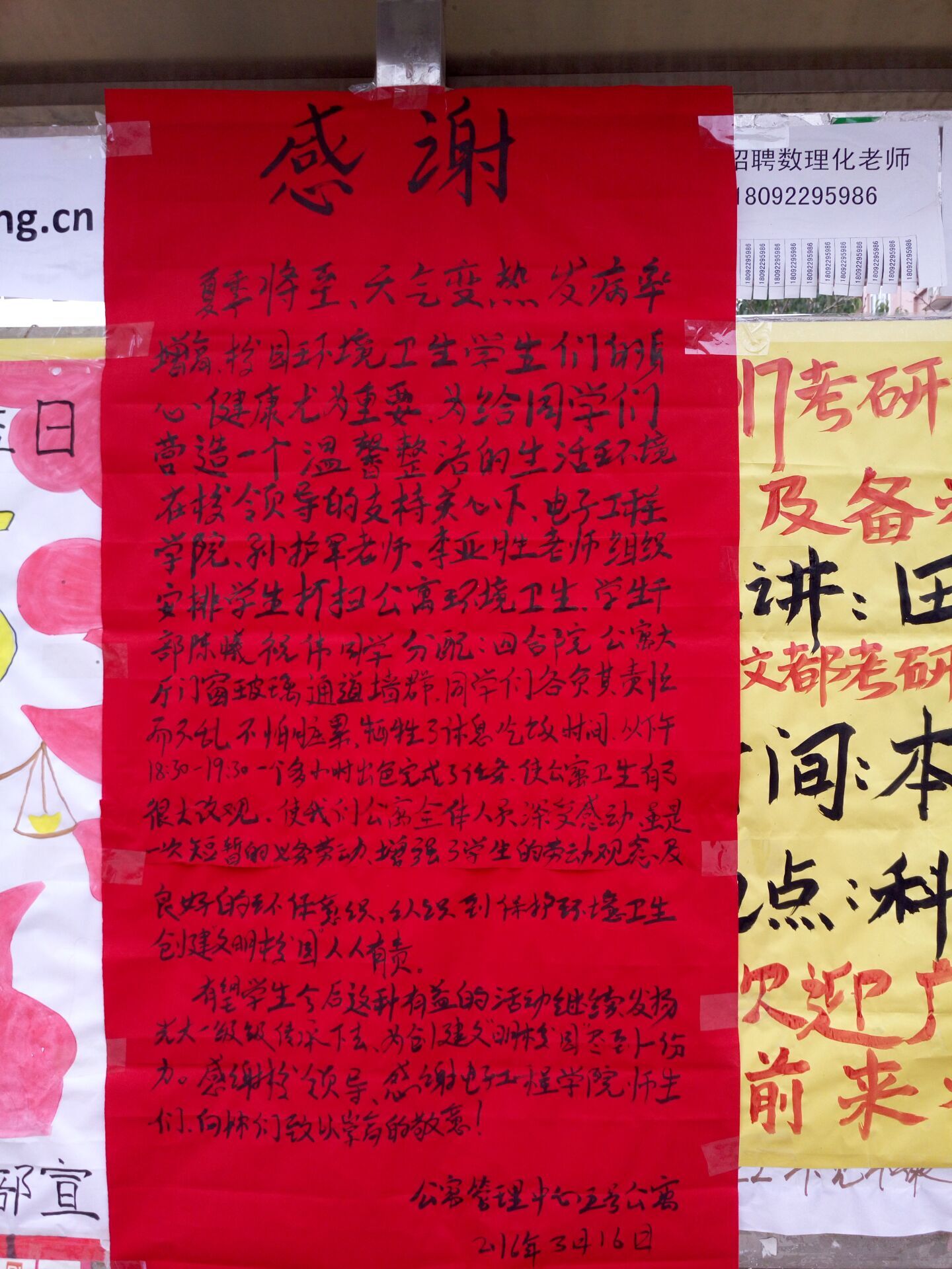 为培养员工的感恩意识,响应公司的雷锋月号召,电子工程公司大二本科在员工管理科科长孙护军老师、辅导员李亚胜老师的号召下,对五号公寓和教学楼三楼的公共教室进行了义务劳动。 2016315日,测控技术与仪器和电气工程及其自动化两个专业的68名同学对五号公寓楼大厅、门窗、楼道和大门外围墙进行打扫,经过一个多小时的打扫,整个宿舍楼恢复了整洁干净明亮的环境。五号公寓宿管阿姨对员工的义务劳动表示感谢,并写了感谢信。