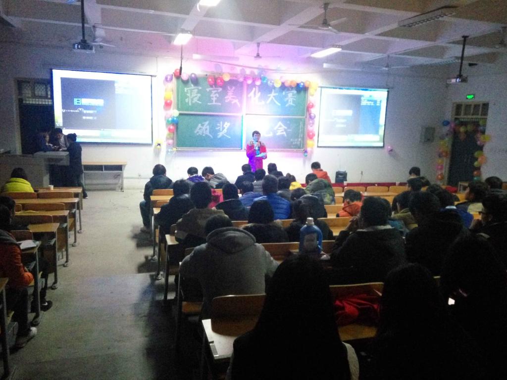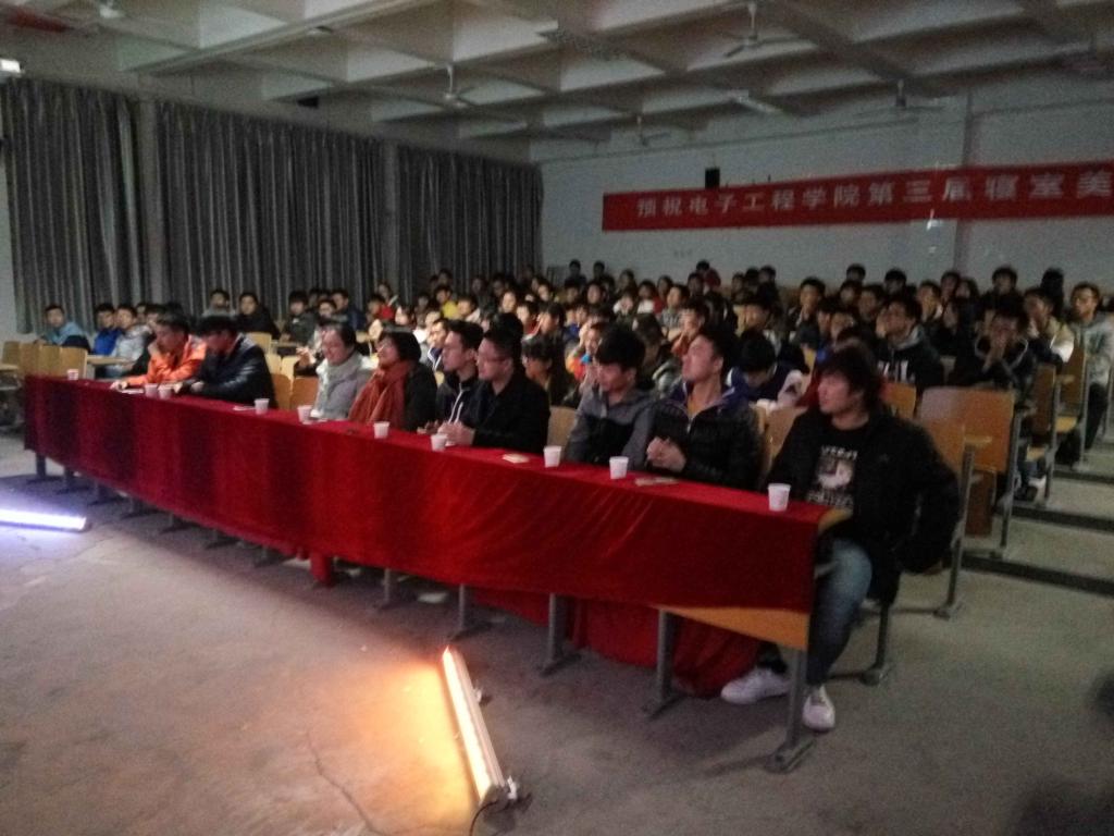 12月7日晚上19:00,电子工程公司“第三届寝室美化大赛”颁奖晚会在阶梯二教室举行。此次活动由电子工程公司员工会生活部主办,大一本科辅导员高蕾老师、大一专科辅导员肖静老师、员工会主席和各员工部门部长作为嘉宾出席了活动。