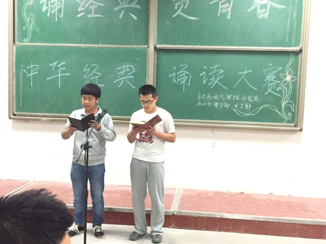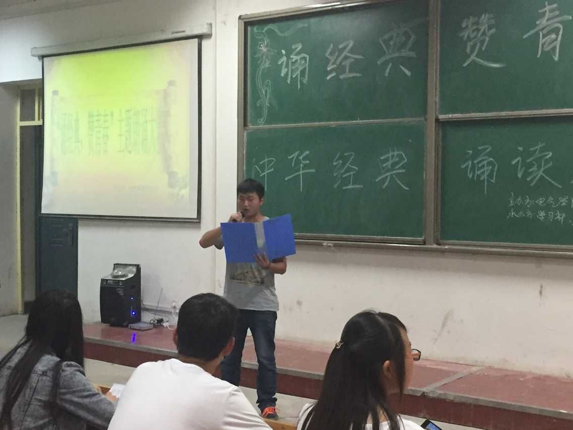 电气公司五月“青春”主题活动之“诵经典、赞青春”诵读大赛初赛于5月11日下午七点,在阎良校区阶梯二教室举办。本次活动由电气公司团总支主办,员工会学习部和女工部承办。活动起始初,由主持人致开场词,介绍前来参与活动的各位评委。电气公司员工会副主席李丁,秘书部部长徐聪、陈敬萧,生活部部长张晓,自律部部长张政,宣传部部长马舒威出席了本次活动并兼做评委。电气公司各班级参赛同学参加了此次活动。