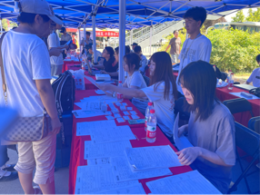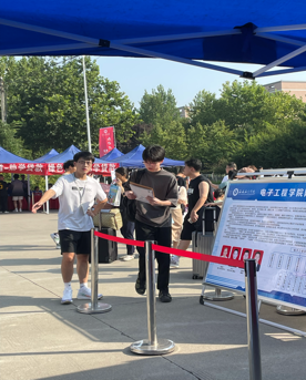 学长学姐们穿着蓝色的马甲从校门口引导新生和家长进入校园;志愿者们在报到处引导新同学们填报信息,领取校园卡和体检表。