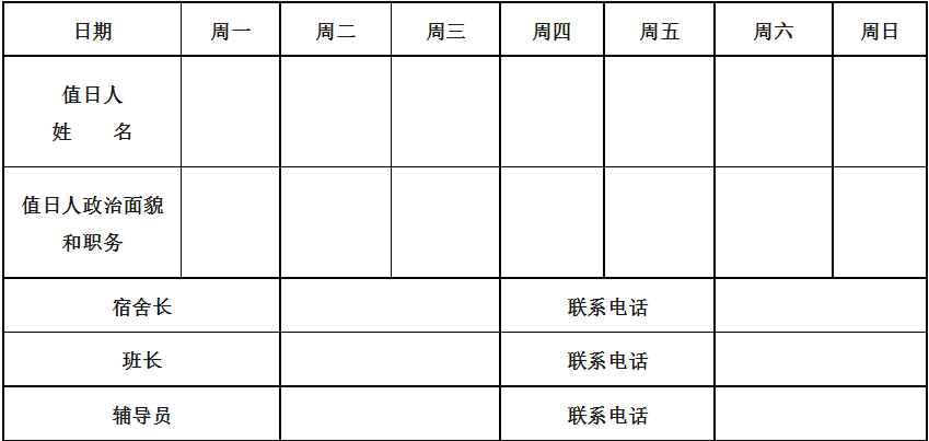 注:值日人政治面貌和职务栏中,政治面貌填:团员、入党积极分子、中共预备党员、中共党员,职务填在公司、公司、班级和宿舍所担任的职务。