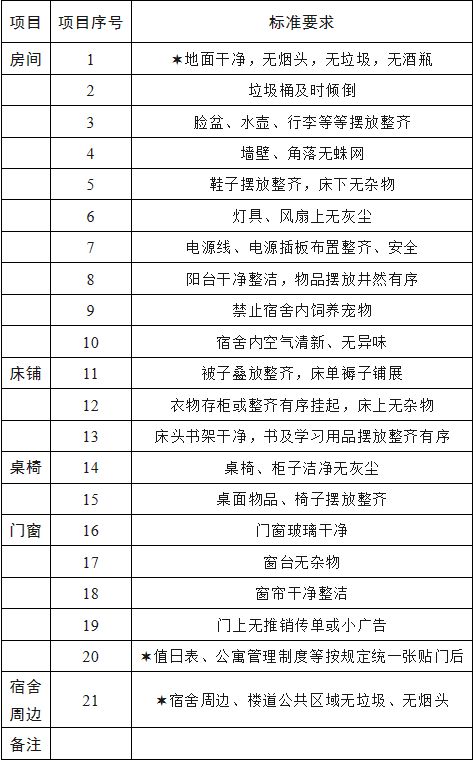 值日人认真做好宿舍公共区域环境卫生清扫和保持,宿舍内及周边楼道公共区域无垃圾、无烟头、无私拉电线等;舍员整理好个人床铺及私人物品;宿舍长、班主任(新生班级)、辅导员做好对值日生及宿舍卫生的督查。