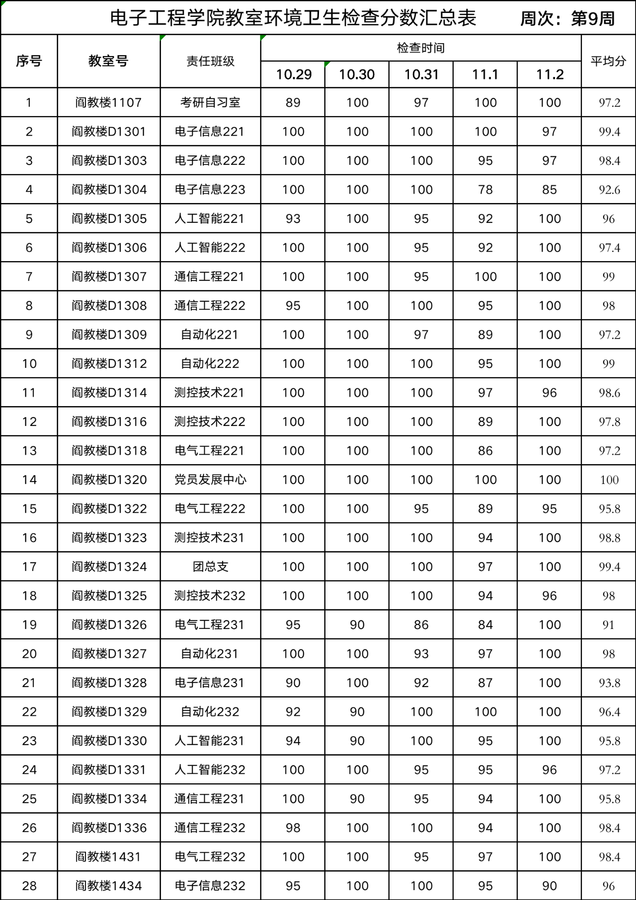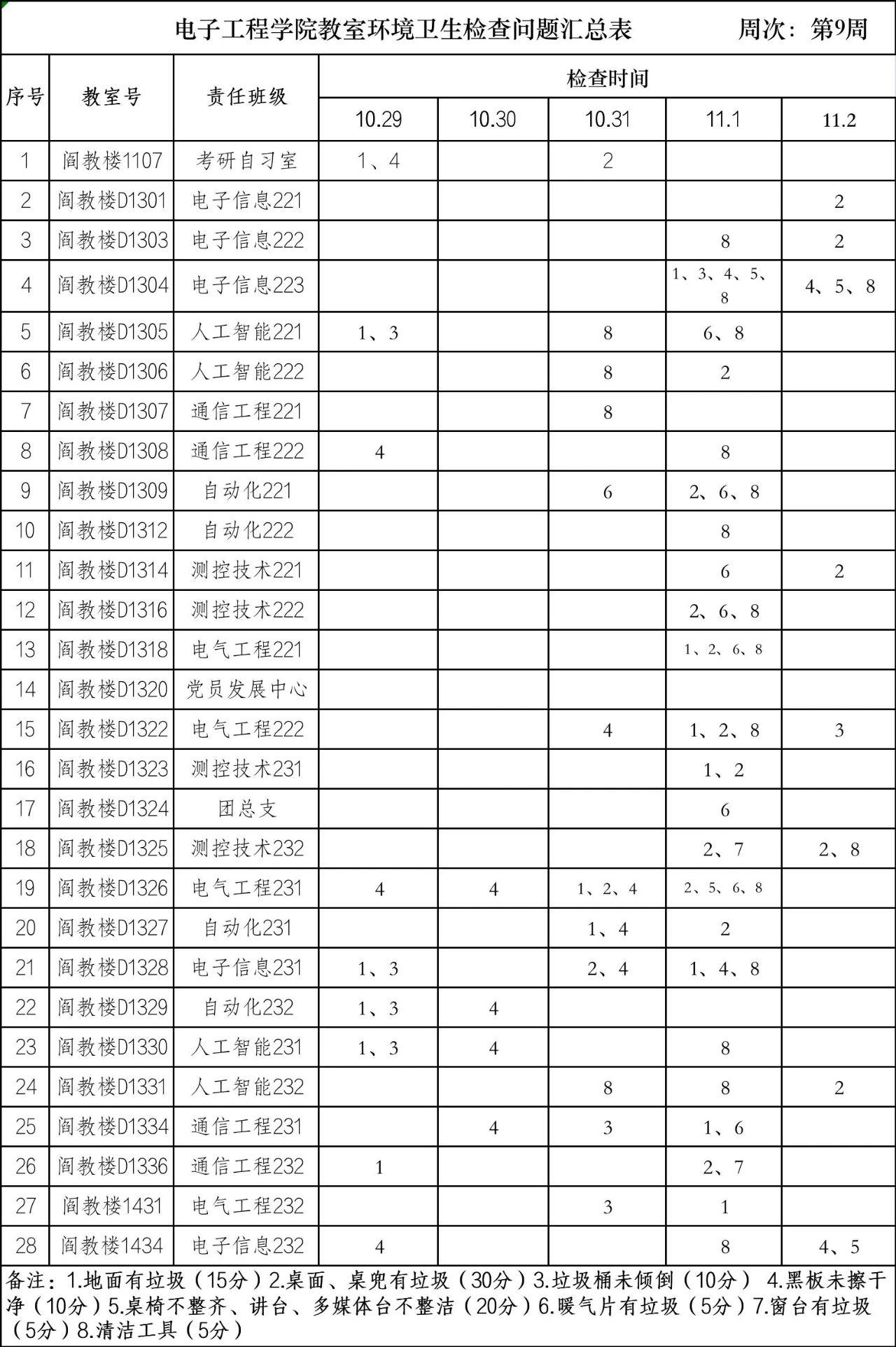 教室是员工学习的重要场所,为了进一步加强员工劳动教育,培养员工尊重劳动的价值观,维护教室的整洁卫生,营造良好的学习氛围,电子工程公司根据教室卫生责任制相关要求,每日对各班卫生责任教室进行环境卫生检查,现将第九周各班责任教室环境卫生检查结果通报如下: