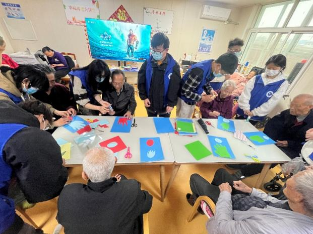 活动伊始,同学们带领老人们进行了剪纸游戏,协助老人们完成了各式各样的图形裁剪,志愿者们耐心的协助使爷爷奶奶们夸赞连连。剪纸游戏结束以后同学们对完成度较高的老人奖励了小红花贴纸。活动现场气氛活跃,欢声笑语络绎不绝。剪纸游戏锻炼了老人们的手脑协调能力,丰富了老人们的日常活动。