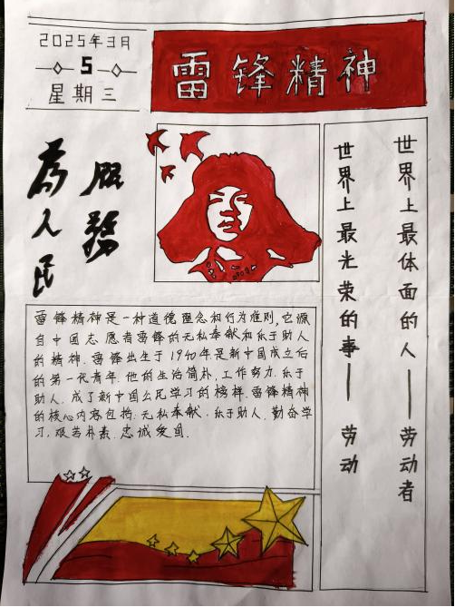 本次活动吸引了同学们的广泛参与,同学们用画笔勾勒雷锋故事,用文字传递志愿精神。一幅幅色彩斑斓的手抄报,既有对雷锋事迹的生动再现,也有对身边“活雷锋”的真情记录,更饱含着同学们对志愿精神的深刻理解。活动一共接收稿件经过评选,12份优秀作品脱颖而出,让我们一起看看同学们的作品吧!