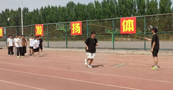 每队两人摇绳,其余人依次跳跃。两分钟内,队员们配合默契,场边"加油"声此起彼伏。