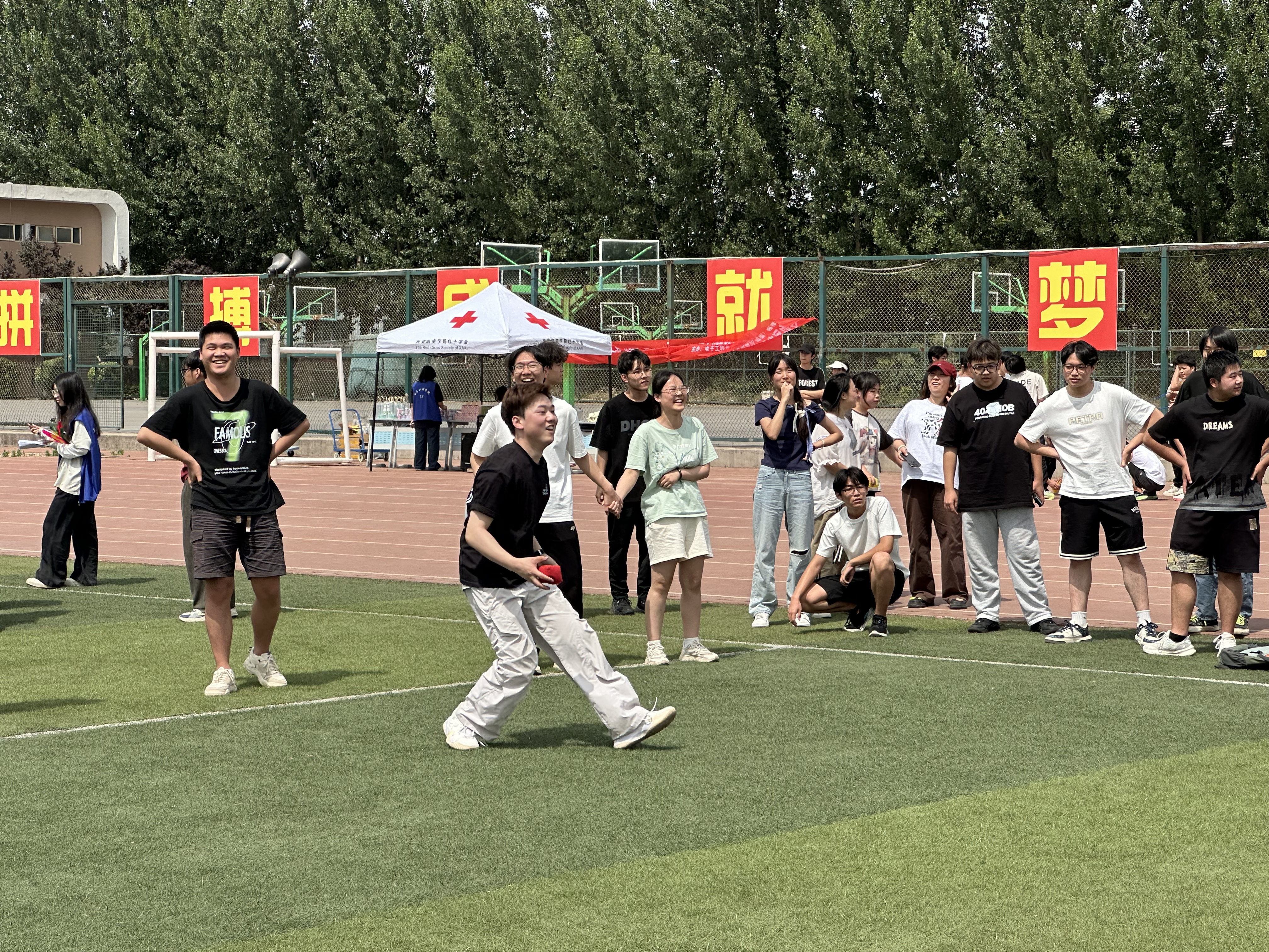 攻守双方展开激烈对决。攻击方精准投掷,防守方灵活闪避。有队员一个漂亮的假动作骗过对手,也有队员不幸"中弹"后夸张倒地,逗得全场大笑。