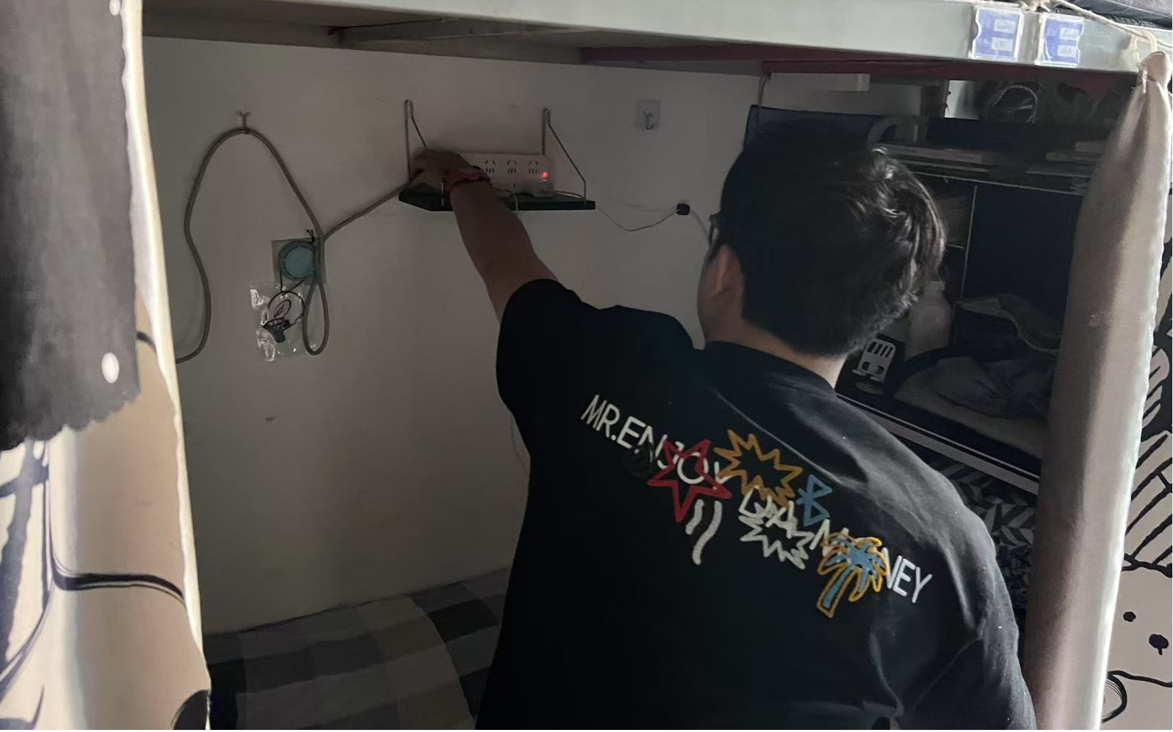冯凯轩是电子信息222班的班长,他把自己形容为2号公寓2333宿舍的"空间规划师",始终相信整洁的环境是高效生活的基石。在他的书桌区域,分层置物架将课本、文具、日用品垂直分区,搭配透明收纳盒实现"一秒定位";衣柜采用可拆卸隔板,四季衣物按色系悬挂,换季时只需整体平移;床底滑轮箱收纳运动器材,墙面网格架悬挂钥匙、耳机等小物,让每寸空间都物尽其用。同时,他还注重实用与美学的平衡:统一色系的收纳工具让视觉更清爽,绿植摆件为功能分区增添生机。