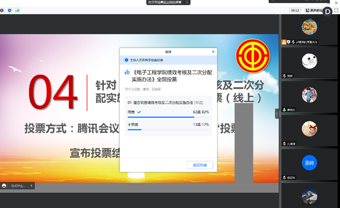 参会人员为75人,占全院人数80%以上,经投票统计,最终62票同意,13票不同意,同意绩效分配方案的人数达参会人数的82%,《电子工程公司绩效考核及二次分配实施办法》获得通过。