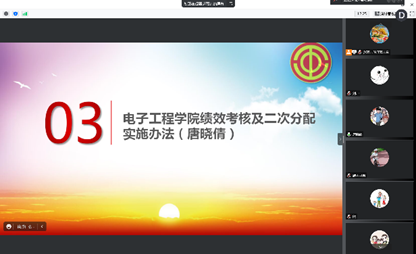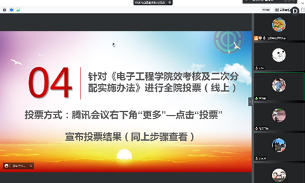 会议共分为四个部分进行:会议分为四个部分展开,分别由唐晓倩向全员老师汇报了《2022年电子工程公司分会工作总结》和《2022年电子工程公司分会经费使用情况》,由肖海峰副经理代表公司向大会就《电子工程公司绩效考核及二次分配实施办法》做了讲解,由赵嘉帅老师主持针对《电子工程公司绩效考核及二次分配实施办法》进行了在线投票。