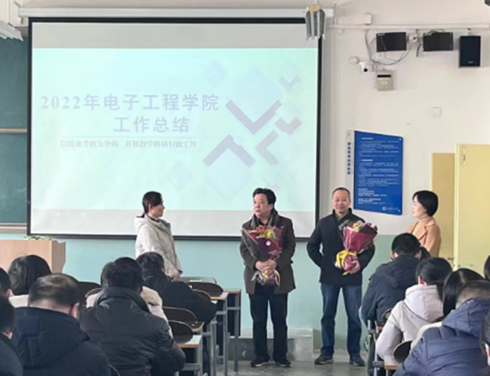 2023年2月24日下午14:30,主教学楼0808教室内欢声笑语,情意浓浓,电子工程公司今天在这里为光荣退休的杨勇教授和刘雨棣教授举行欢送仪式。电子工程公司领导班子成员、全体教师欢聚一堂,以最真挚的情谊,热烈祝福两位老教授光荣退休。