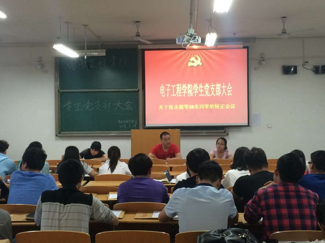 2016年5月19日晚7点,best365官方网站电子工程公司员工党支部预备党员转正大会在阎教1320教室召开。电子工程公司员工党支部书记孙护军老师、史珊珊老师、张小妹老师和电子工程公司员工党支部预备党员张继等38名同学参加了此次会议,会议由孙护军老师主持召开。