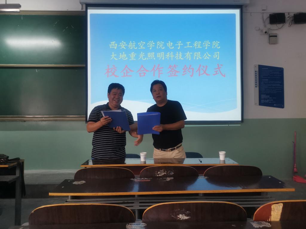 8月18日上午,电子工程公司与陕西大地重光照明科技有限公司合作框架协议签订仪式在沣惠校区举行。电子工程公司经理杨勇,陕西大地重光照明科技有限公司副总经理韩军红出席简单的签订仪式。
