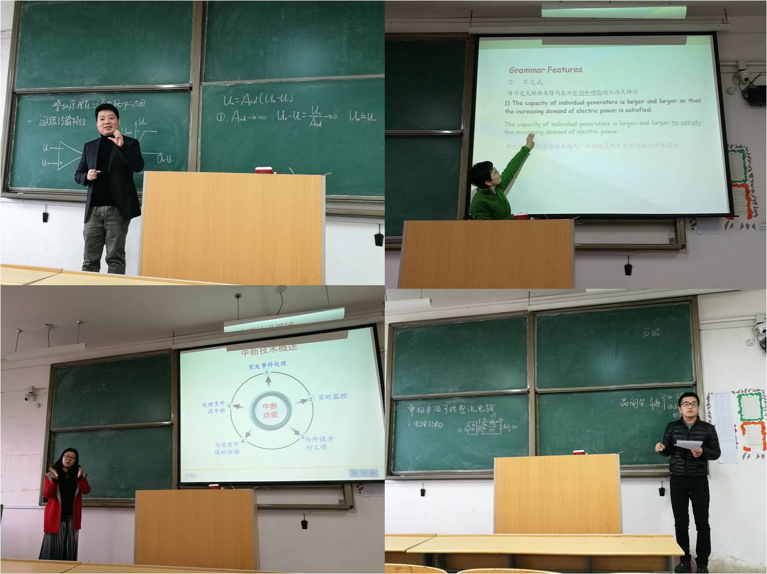 赵东波、王莘、刘阳、王琳、马昭、王媛等6教师参加了微课比赛,赵东波对《叠加原理在运算电路中的应用》进行讲解,赵老师在有限时间内高超的导入技巧和讲解方式令人耳目一新;王琳老师对《51单片机的中断系统》进行微课展示,简洁到位的PPT演示出中断技术的应用场合;王媛老师对《电力系统继电保护》一课进行讲解,清晰的图解举例阐释着她对课程清晰的把控能力,其他老师也针对各自选取题目进行微课展示,老师们精神抖擞,意气风发。