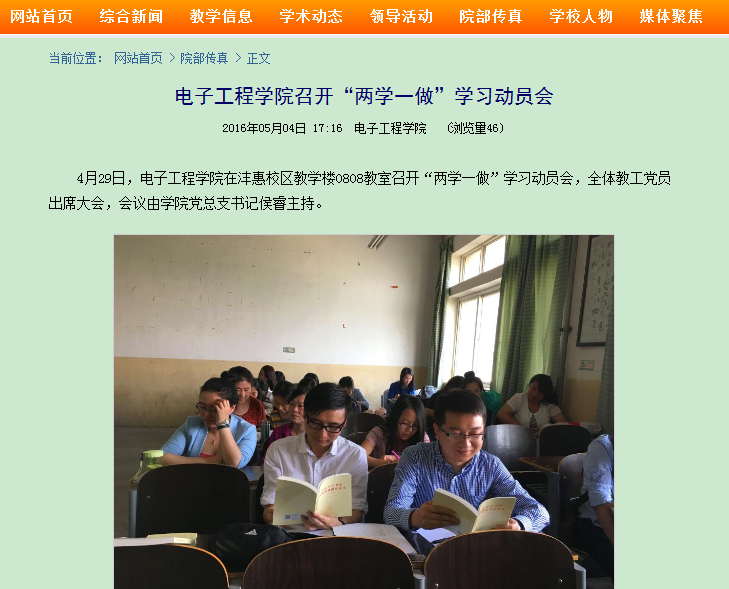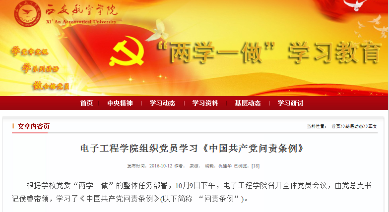 2016年春以来,电子工程公司在公司“两学一做”学习教育的统一部署下,积极定计划,抓落实。首先邀请张同怀副董事长、公司党总支书记、经理讲党课,保证一月一次的集中学习;其次,要求所有党员教师制定学习计划,定期检查学习笔记,在党总支和教研室党小组反复交流学习心得,弥补不足;再次,主抓落实,通过设立“党员先锋岗”,对全院教师党员排班定岗,晚间留阎良校区,为员工答疑解惑。