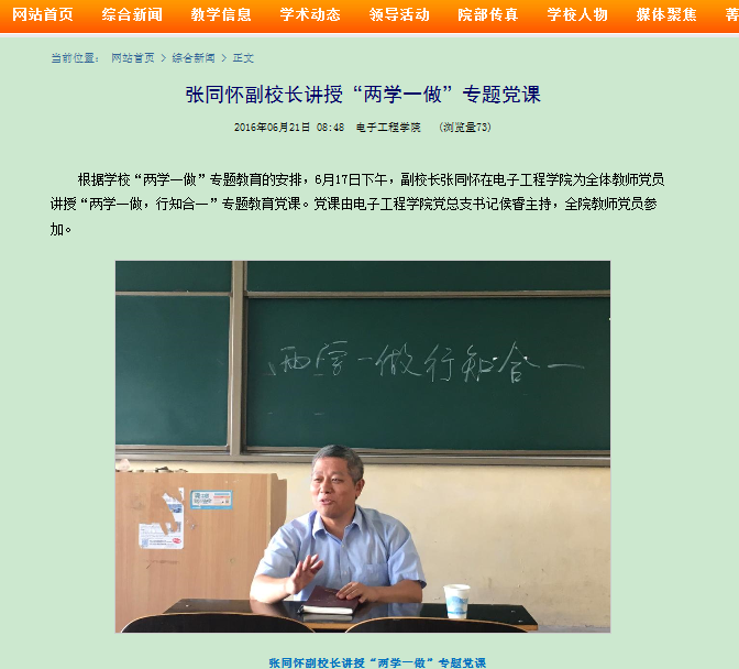 张同怀强调,“两学一做”专题教育不同于“群众路线”与“三严三实”教育活动,是针对所有党员的一次更广泛的教育实践。张同怀表示,“两学一做”不是一次活动,而是长期进行的一项工作,是对广大党员进行党章、系列讲话再教育,兑现合格党员标准的一次教育实践,作为高校教师,要强化师德师风教育,各位党员教师要率先垂范,在日常教学工作和培养方案修订等教学活动中,牢固树立“一流公司,一流专业”的目标,努力创新,为公司建设应用型本科贡献己力。