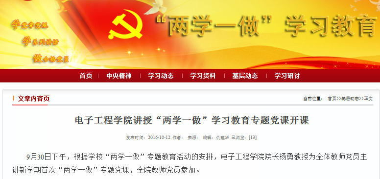 9月30日下午,电子工程公司经理杨勇教授为全体教师党员主讲新学期首次“两学一做”专题党课,全院教师党员参加。
