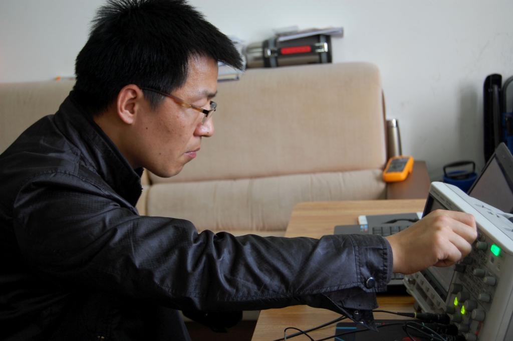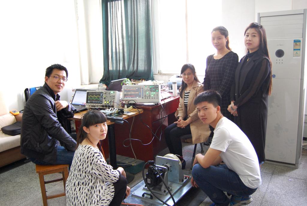 2016年4月16日,周六,下午四点。当笔者走进肖海峰位于教学北楼的实验室,不禁被实验室的工作氛围所感染,甚至找到了读研究生在实验室的感觉:人员聚齐,工作不分周末,三个男生就住在实验室。图1为团队成员与刚刚调试成功的磁粉刹车器系统合影, 图2为肖海峰在调试示波器。