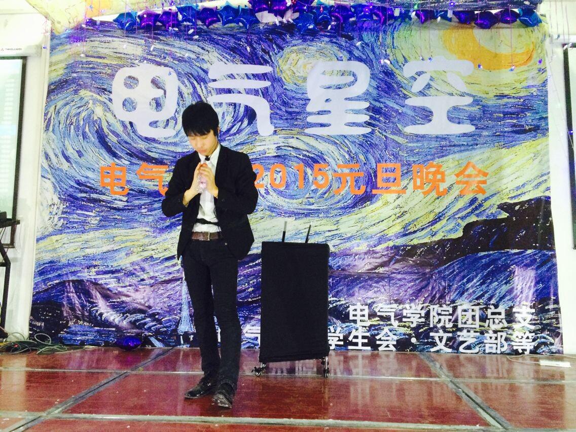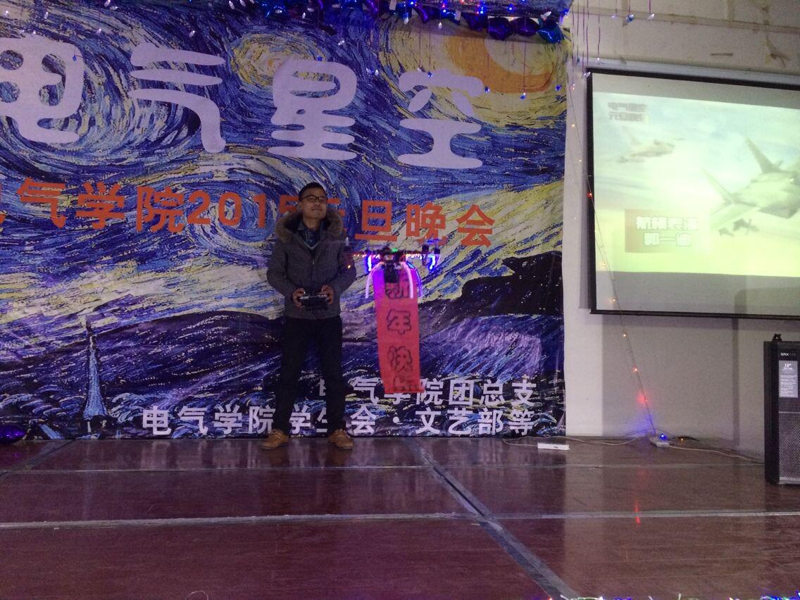 晚会现场以“电气星空”为主题,舞台上空点缀了由公司员工制作的近300颗“星星”LED灯,教室四周墙壁星星环绕,还有近200颗“星星”LED灯“散落”在到场观众手中,走进会场,仿佛置身于夜空繁星之下。在以话乐队的《平凡之路》的火爆开唱中,电气公司2015元旦晚会正式拉开了序幕。晚会的节目内容精彩,形式丰富多样,有乐器演奏、现代舞、街舞、B-BOX、古典舞,独唱、歌伴舞、情景剧、小品、航模特技、魔术等应有尽有。晚会现场还有演员和观众的互动、对老师的采访、现场抽奖等,十分具有特色。整台晚会不管是温雅婉约的歌伴舞《当爱已成往事》还是温文尔雅的《青花瓷》,无论是性感火爆的爵士舞《nice boy》还是令人回味无穷的《the body》,或者是幽默诙谐的情景剧《新闻调播》,令人惊喜连连的魔术《互动与伞》,象征梦想的航模飞在星空上,每个精心选择的节目都很出彩,每个精彩的节目都体现了公司员工昂扬向上的青春风采。