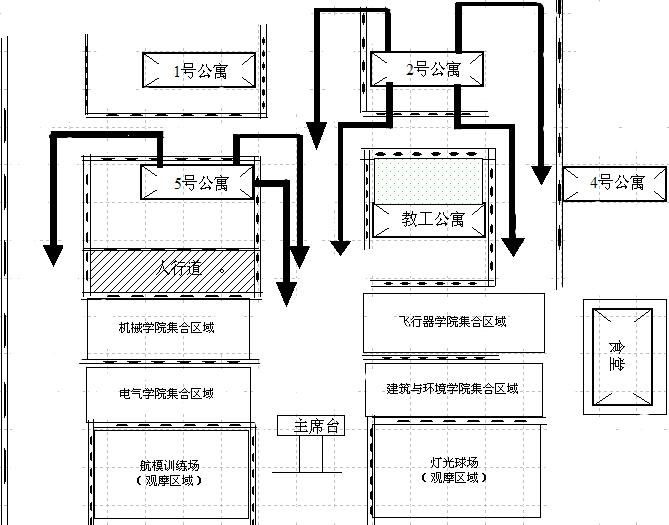 主席台在灯光球场与航模训练场中间路口位置、员工集合点在5#员工公寓和教工公寓以南路面及人行道(详见附件3)。
