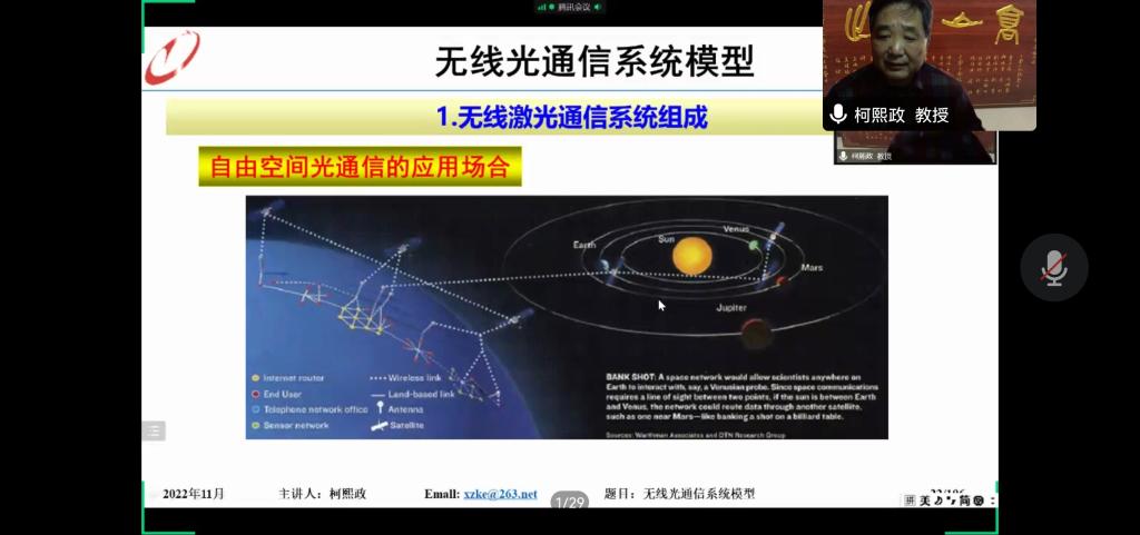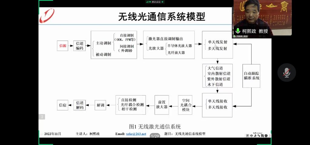 报告中,柯熙政教授首先介绍了光通信中有线光通信与无线光通信的概念和区别。并且根据系统功能,介绍了无线相干光通信的系统概念以及各个部分的功能,同时介绍柯教授本人在该领域所做的工作,以及在研究过程中提出的“柯氏模型”。
