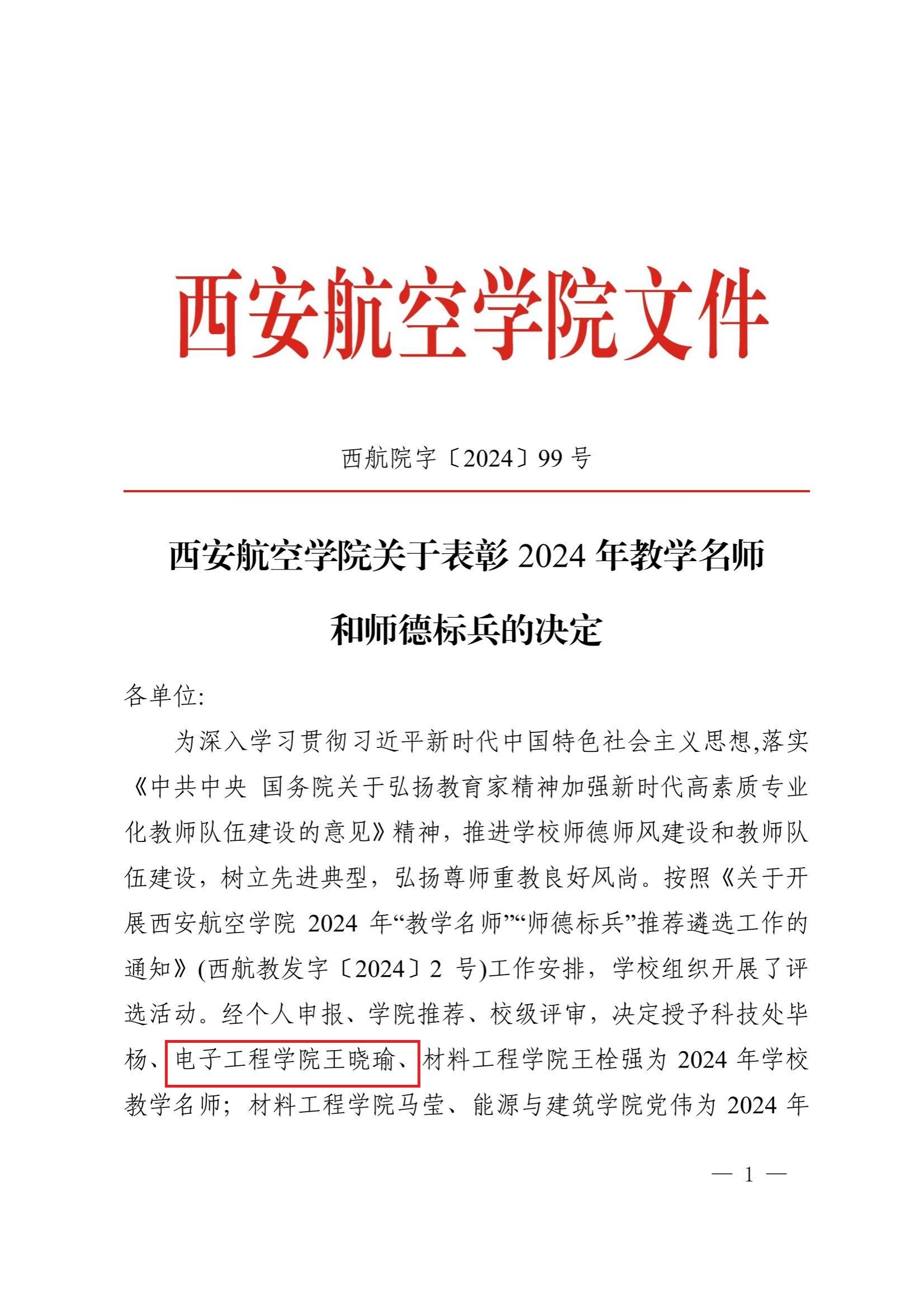 公司教师王晓瑜获评2024年度校级教学名师
