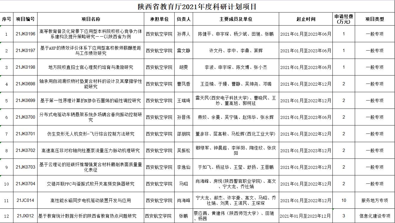 根据《陕西省教育厅科研计划项目管理办法》,经公司遴选推荐,省教育厅组织审核、专家评审、厅务会审定和公示,最终确立了陕西省教育厅2021年度科研计划。现将有关事项说明如下: