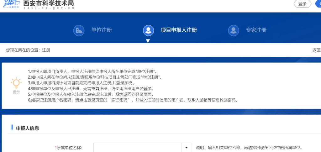 (一)科技计划项目线上申报。指南中发布的各类计划项目均须通过线上和线下申报。线上申报登陆“西安市科技政策服务综合管理系统”(网址:),进行注册并登录填报。申报老师进入系统后点击图一右下角“注册”,在图二中选择“项目申报人注册”可自行注册账号,务必记清楚自己注册的账号密码。