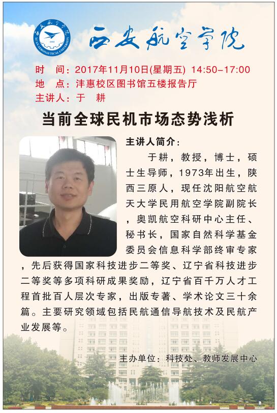 为促进学术交流,营造学术氛围,便于师生了解和把握民机市场的全球现状及发展趋势,科技处特邀沈阳航空航天大学民用航空公司副经理、奥凯航空科研中心主任于耕教授来公司作题为“当前全球民机市场态势浅析”的学术讲座,欢迎广大师生踊跃参加。现将相关事项通知如下: