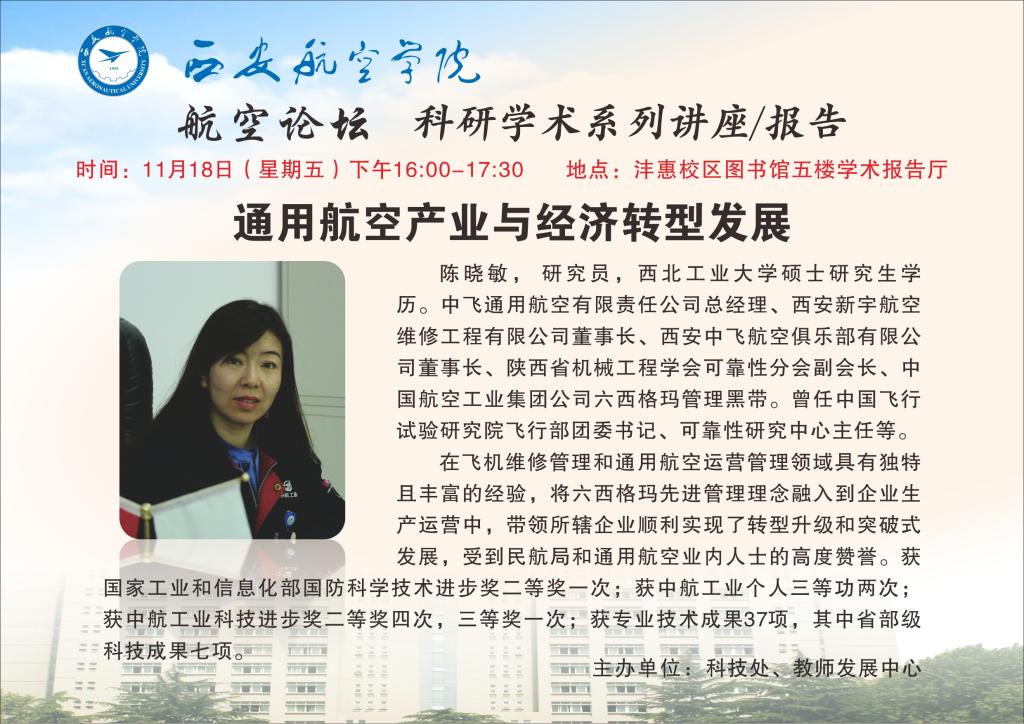 为促进学术交流,提高学术氛围,便于师生了解通用航空产业及其对经济转型发展的作用,科技处特邀中飞通用航空有限责任公司总经理陈晓敏来公司作题为“通用航空产业与经济转型发展”的学术讲座,欢迎广大师生踊跃参加。