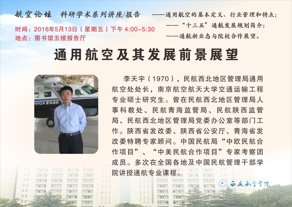 为促进学术交流,提高学术氛围,便于师生了解通用航空的现状、趋势和发展战略,科技处特邀请民航西北地区管理局通用航空处处长李天宇来公司作题为“通用航空及其发展前景展望”的学术讲座,欢迎广大师生踊跃参加。