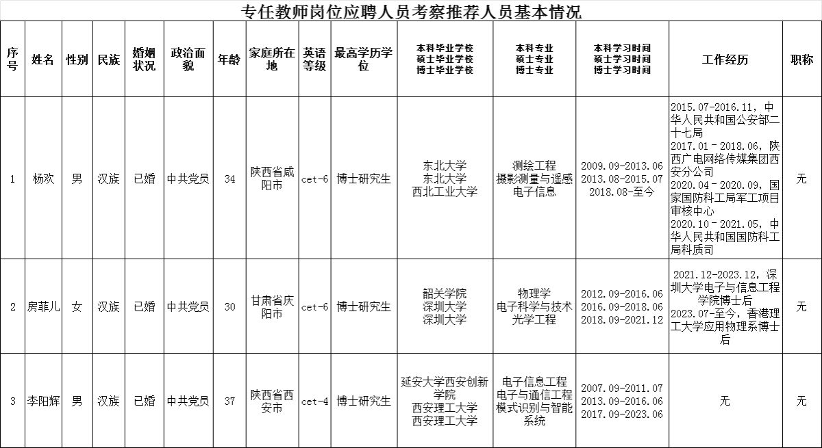 电子工程公司9月专任教师岗位应聘人员考察推荐人员基本情况