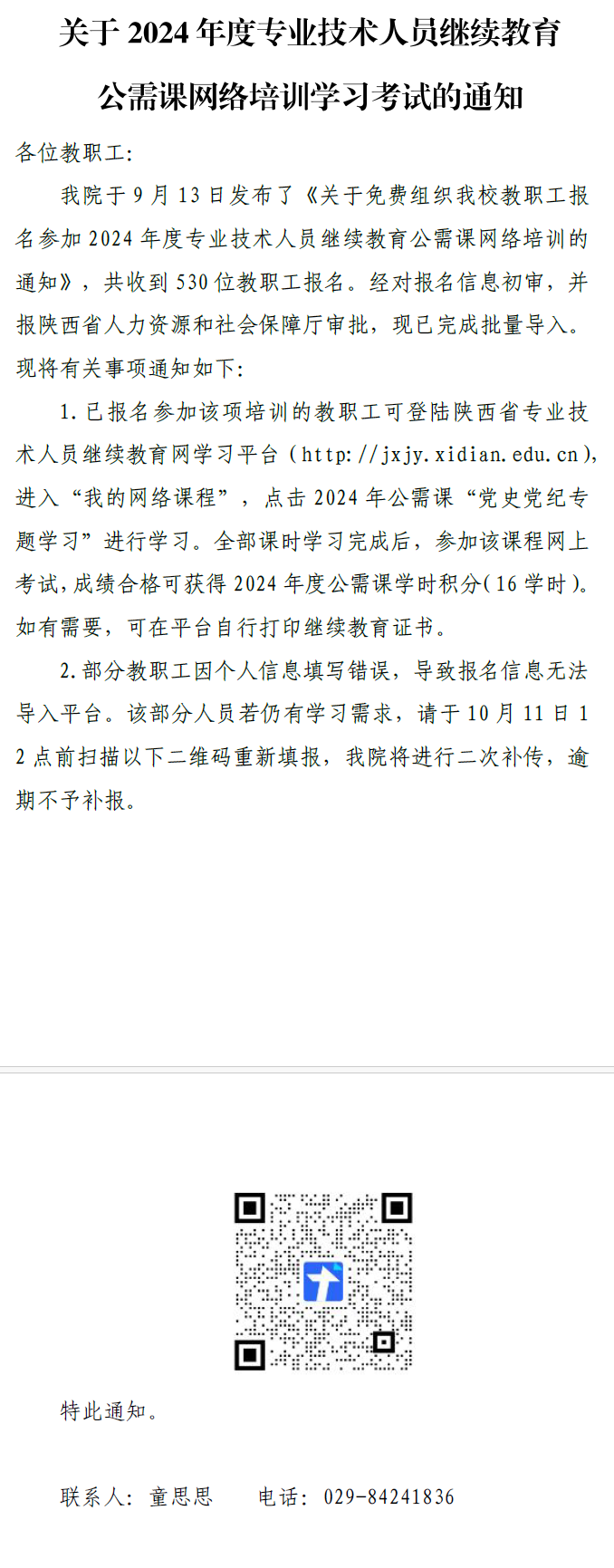 关于2024年度专业技术人员继续教育公需课网络培训学习考试的通知