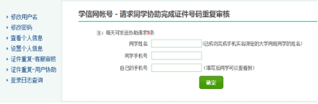 通过左侧菜单的“证件重复-用户协助”来解决证件号码重复的问题。进入页面后点击发送协助请求按钮,输入同班同学姓名等信息(注册的真实信息和手机号码),发送一条求助信息即可。