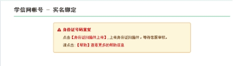 ⑵ 注册时提示姓名、身份证重复:通过系统功能或者操作提示找回已有帐号。若重复注册,系统会在信息审核通过后注销旧有帐号。