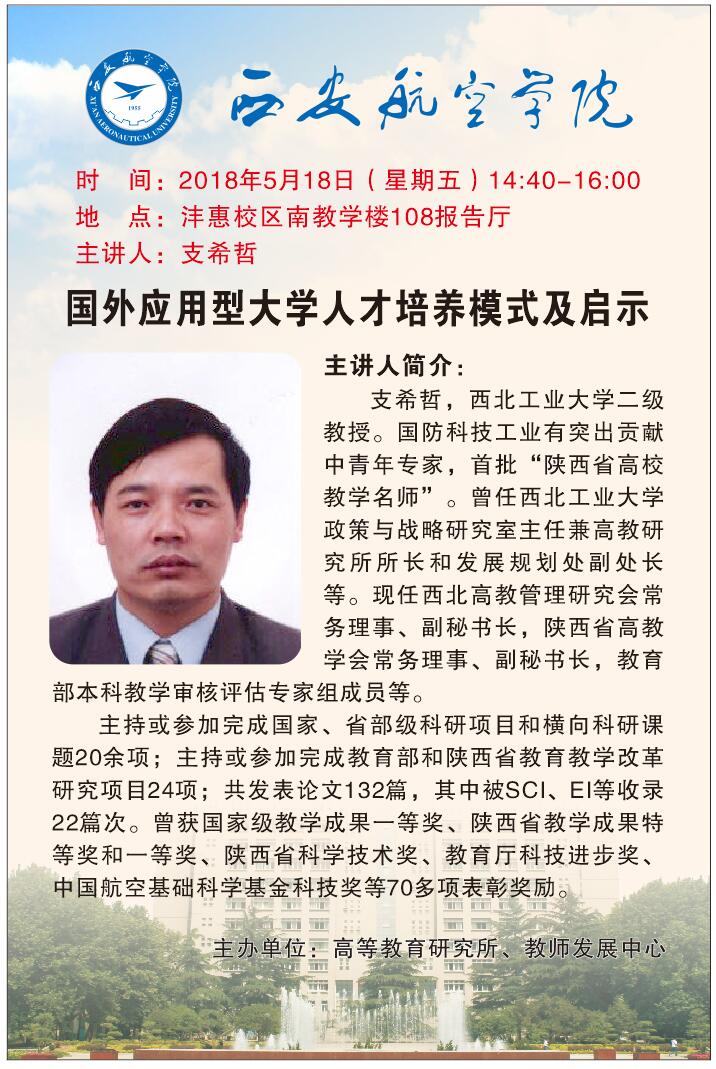 为促进学术交流,营造学术氛围,便于师生了解和把握国外应用型大学人才培养现状及发展趋势,科技处特邀西北工业大学支希哲教授来公司作题为“国外应用型大学人才培养模式及启示”的学术讲座,欢迎广大师生踊跃参加。现将相关事项通知如下: